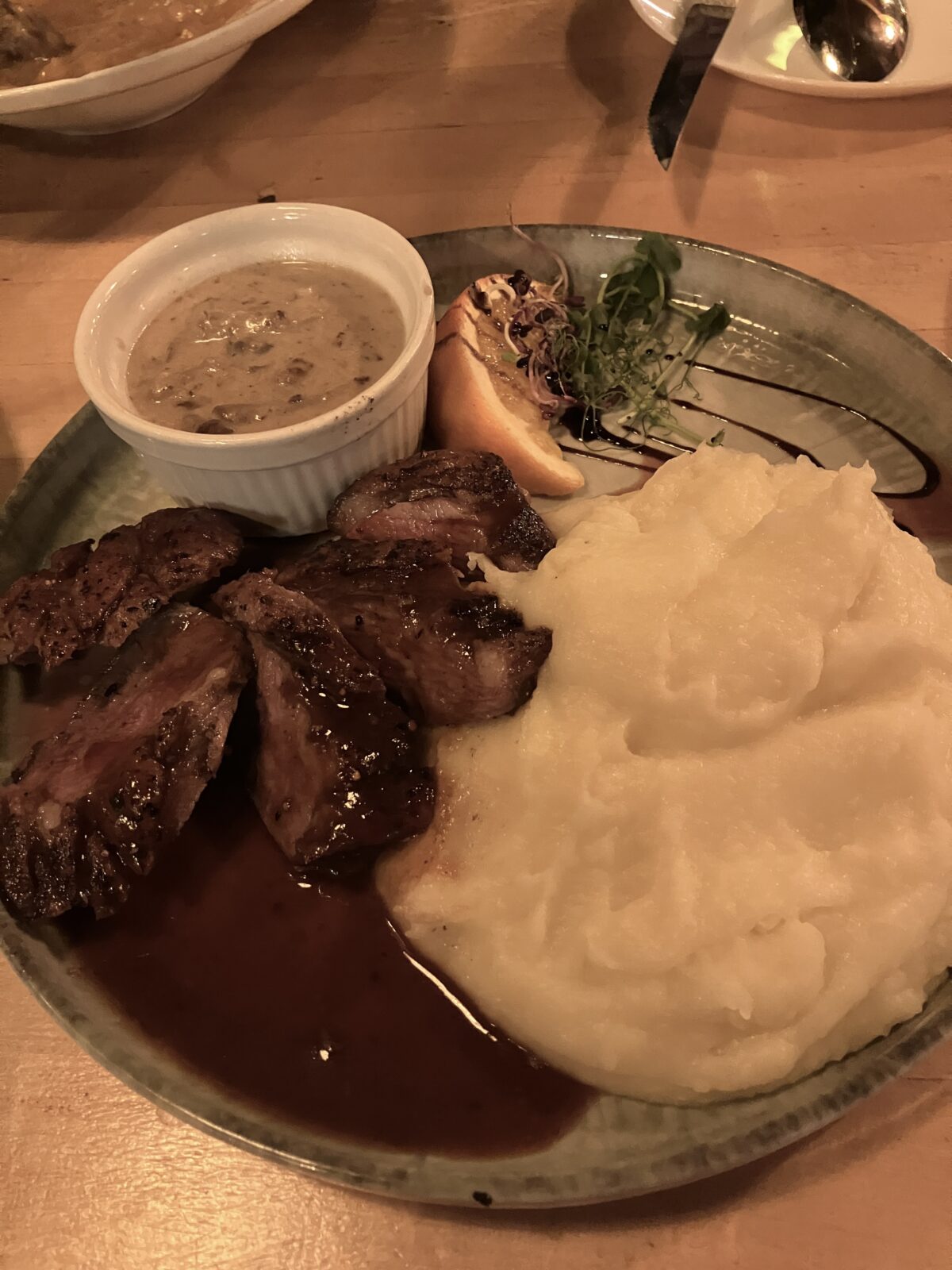 肉は少し硬めでしたが、濃厚なマッシュルームソースが絶品。